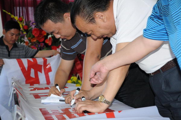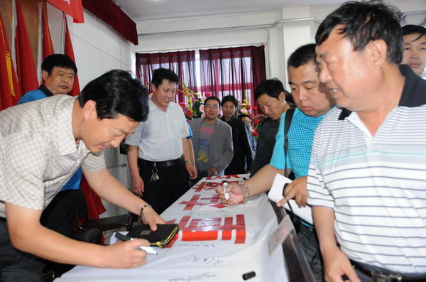 安監(jiān)站領(lǐng)導(dǎo)與董事長在安全宣傳標語上簽名 |